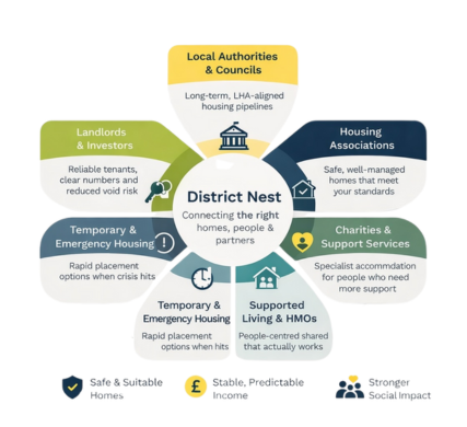 We bring landlords, councils, housing associations and charities together,agreeing clear roles so everyone pulls in the same direction.